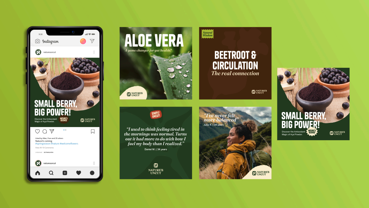 We conducted a strategic brand audit to uncover Nature’s Uncut’s essence, values, and differentiators. From this foundation, we developed a refined Brand DNA framework—defining its archetype, voice, and promise—and applied it through a visual rebrand that balanced science, nature, and trust. The result was a cohesive brand identity designed to inspire confidence and connection with health-conscious consumers.